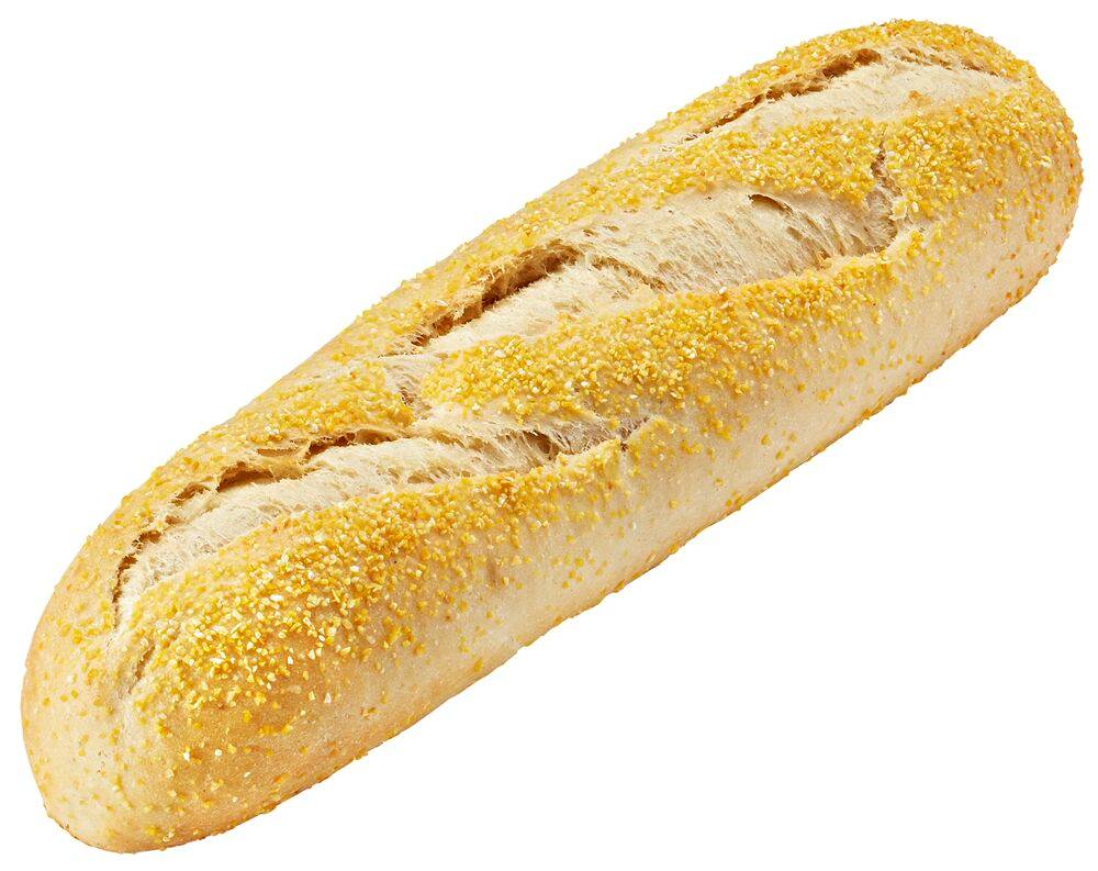 Ljus baguette med potatisflingor i degen som ger ett mjukt och saftigt inkråm. Toppad med grovt majsmjöl för god smak och fint utseende. Ca 25 cm lång. Tina & Servera.